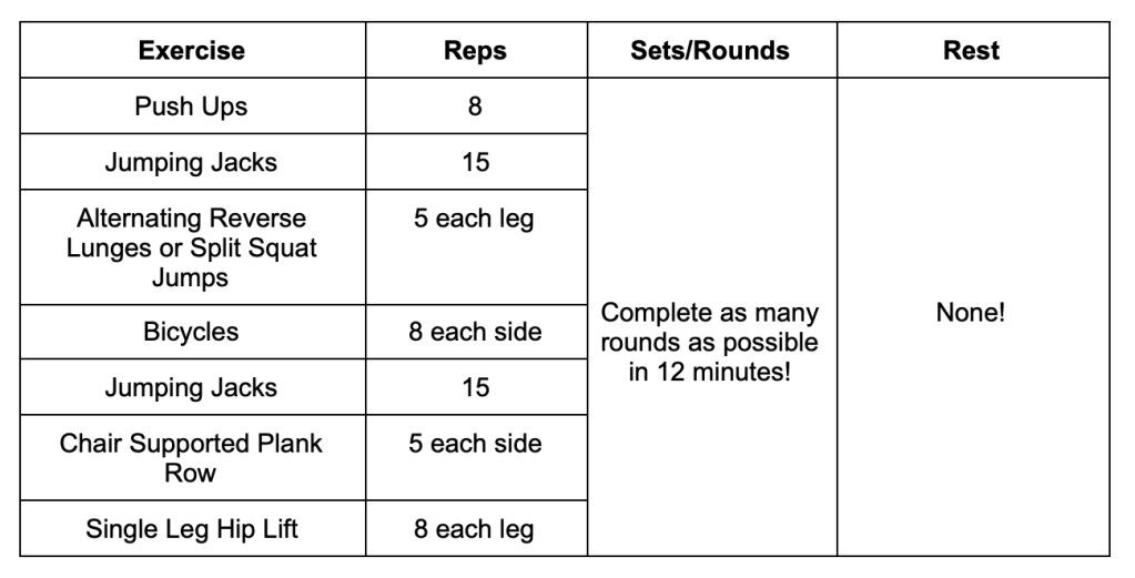 - 5 push ups + 5 alternating split squat jumps without rest for 8 minutes